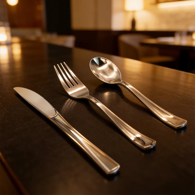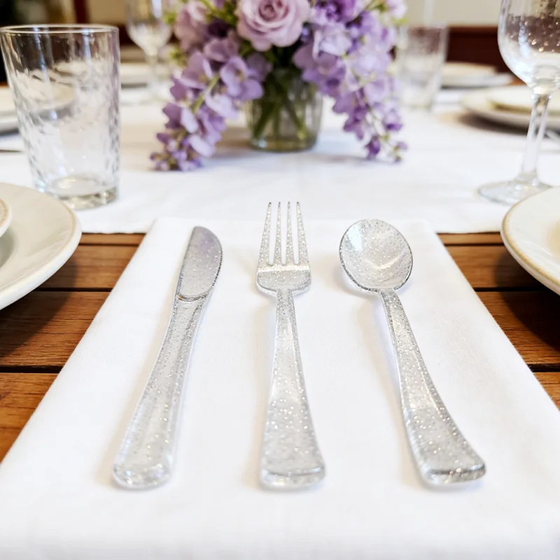সাধারণ ডিসপোজেবল টেবিলওয়্যার এবং ঐতিহ্যবাহী ধাতব টেবিলওয়্যারের তুলনায়, ক্লাসিক পার্টি ছুরি কাঁটা চামচ প্লাস্টিক কাটলারি টেক্সচারের দিক থেকে আলাদা। পণ্যের পৃষ্ঠটি বিশেষ চিকিত্সার মধ্য দিয়ে গেছে, ধাতুর সাথে তুলনীয় একটি গ্লস অর্জন করেছে। ধাতব রঙের মডেলগুলি একটি পরিমার্জিত এবং মার্জিত পরিবেশ তৈরি করে, অন্যদিকে স্বচ্ছ মডেলগুলি পরিষ্কার এবং স্বচ্ছ, সম্পূর্ণরূপে নিষ্পত্তিযোগ্য টেবিলওয়্যারের সস্তা ছাপকে ভেঙে দেয়। ডিজাইনের ক্ষেত্রে, টেবিলওয়্যারটিতে মসৃণ এবং নিয়মিত লাইন রয়েছে, যা পুরোপুরি সৌন্দর্য এবং ব্যবহারিকতাকে একীভূত করে।