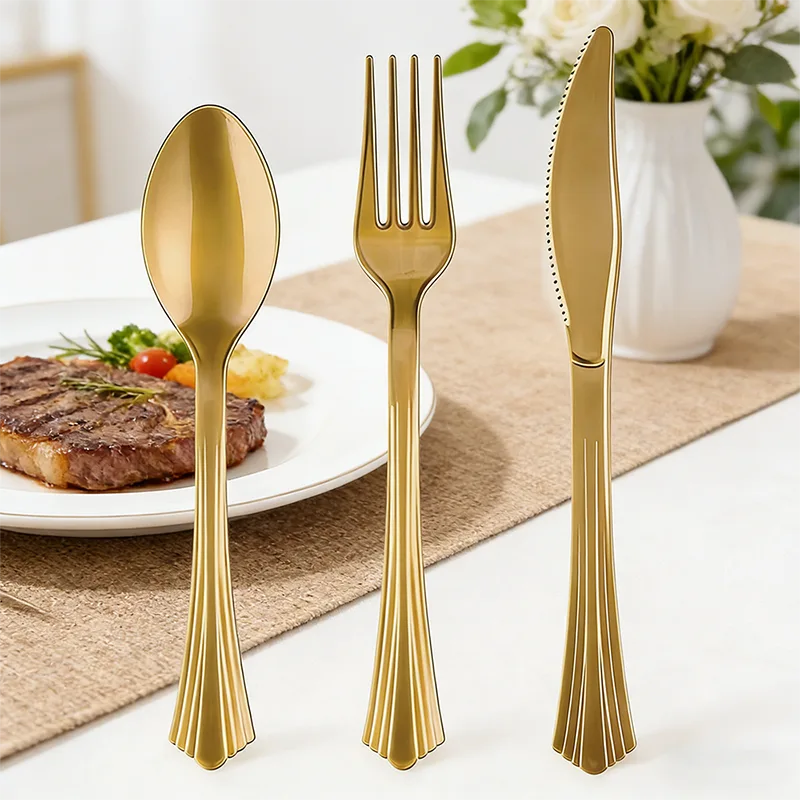 আপনার যদি প্রিমিয়াম ফিশটেল প্লাস্টিক কাটলারির মূল্য তালিকার প্রয়োজন হয়, অনুগ্রহ করে Ningbo Powerr Plastic Products Co., Ltd, যেটি চীনের একটি পেশাদার উত্পাদনকারী তা সন্ধান করুন৷ এই সেটটি তার বিবরণে পরিশীলিততা লুকায়। কাটলারির প্রান্তে একটি অনন্য 3D ফ্যান-আকৃতির কনভারজেন্স ডিজাইন রয়েছে, যার মসৃণ প্রান্তগুলি পাম-বন্ধুত্বপূর্ণ আঁকড়ে ধরার জন্য এবং ভাস্কর্যের চেহারার জন্য একটি মার্জিত মাছের লেজের বক্রতা তৈরি করে। ইউনিফর্ম সোনালী আবরণ সূক্ষ্ম আলো এবং অন্ধকার স্তর তৈরি করে, প্লাস্টিককে যথেষ্ট ধাতুর মতো অনুভূতি দেয়, যখন শিলাগুলি অলঙ্করণ এবং নন-স্লিপ কার্যকারিতা উভয়ই যোগ করে, এমনকি চর্বিযুক্ত হাতেও একটি দৃঢ় ধরে রাখা নিশ্চিত করে। প্রায়শই একটি পার্টি সেট হিসাবে মিলে যাওয়া সোনার ডিসপোজেবল কাপ এবং প্লেটের সাথে জুড়ি দেওয়া হয়, ইউনিফাইড গিল্ডেড স্টাইল টেবিল সেটিংসকে উন্নত করে। পুল পার্টি, বারবিকিউ, বিবাহ বা দল-নির্মাণ ইভেন্টের জন্য আদর্শ, এর একক-ব্যবহারের নকশা কমনীয়তা ত্যাগ না করেই সুবিধা প্রদান করে, পরিশীলিততা এবং ব্যবহারিকতাকে নির্বিঘ্নে সামঞ্জস্যপূর্ণ করে তোলে।